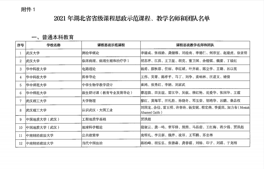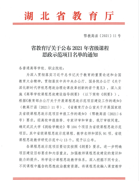 鄂教高函〔2021〕11号 省教育厅关于公布2021年省级课程思政示范项目名单的通知(6号)