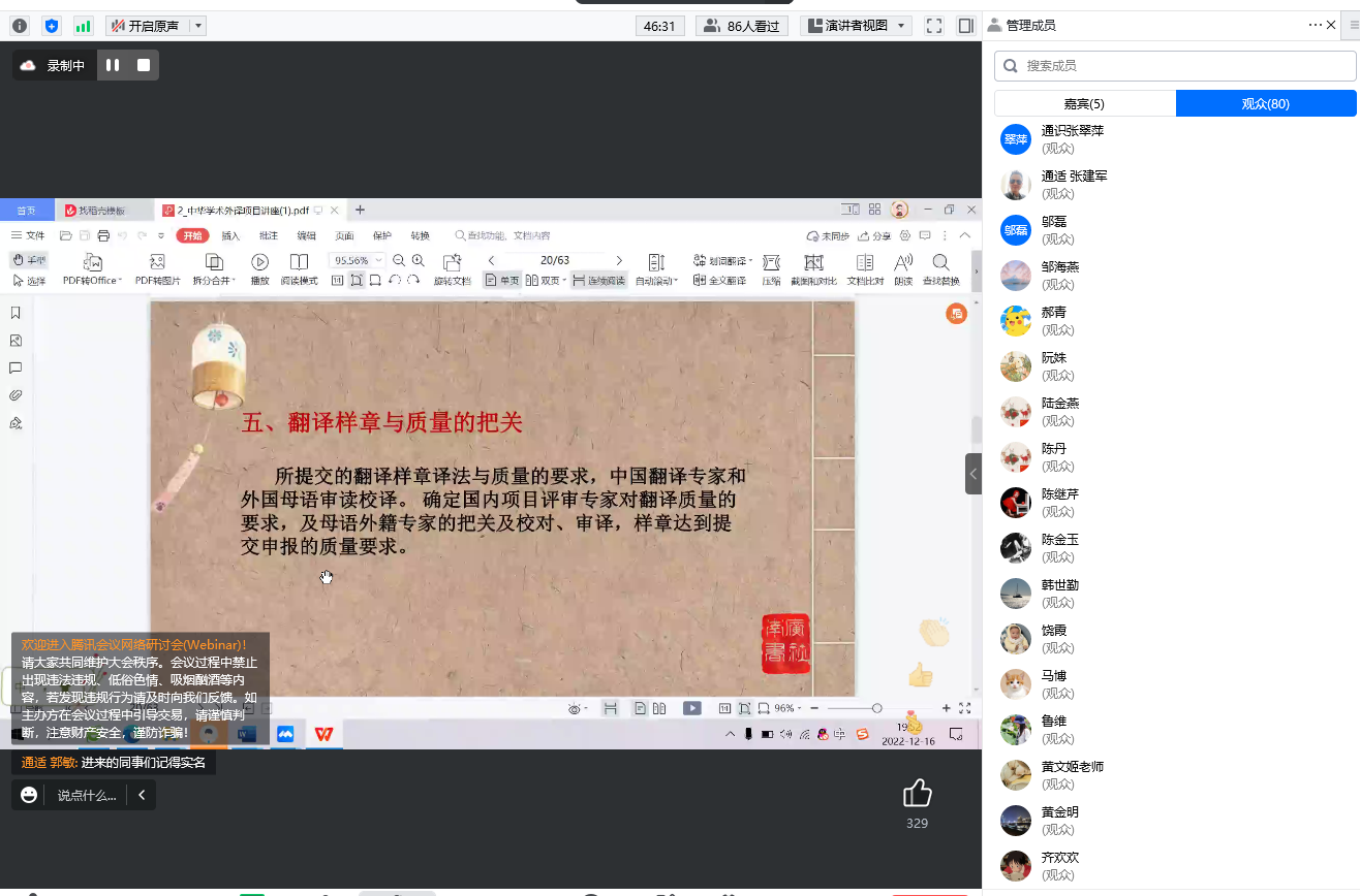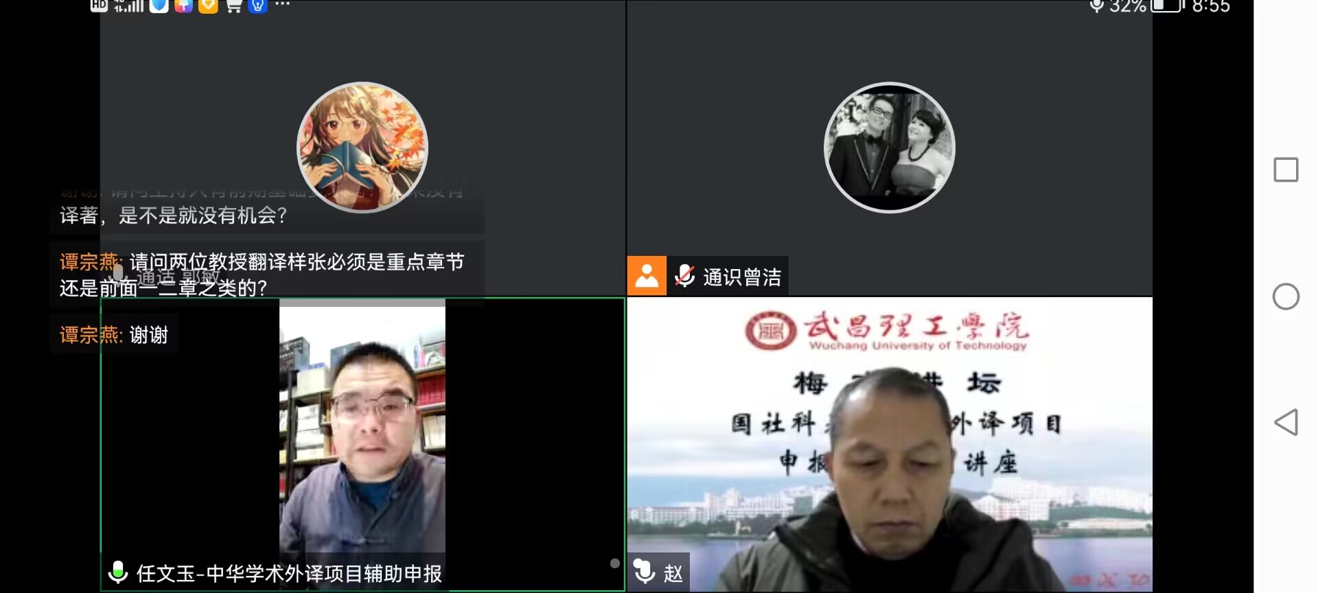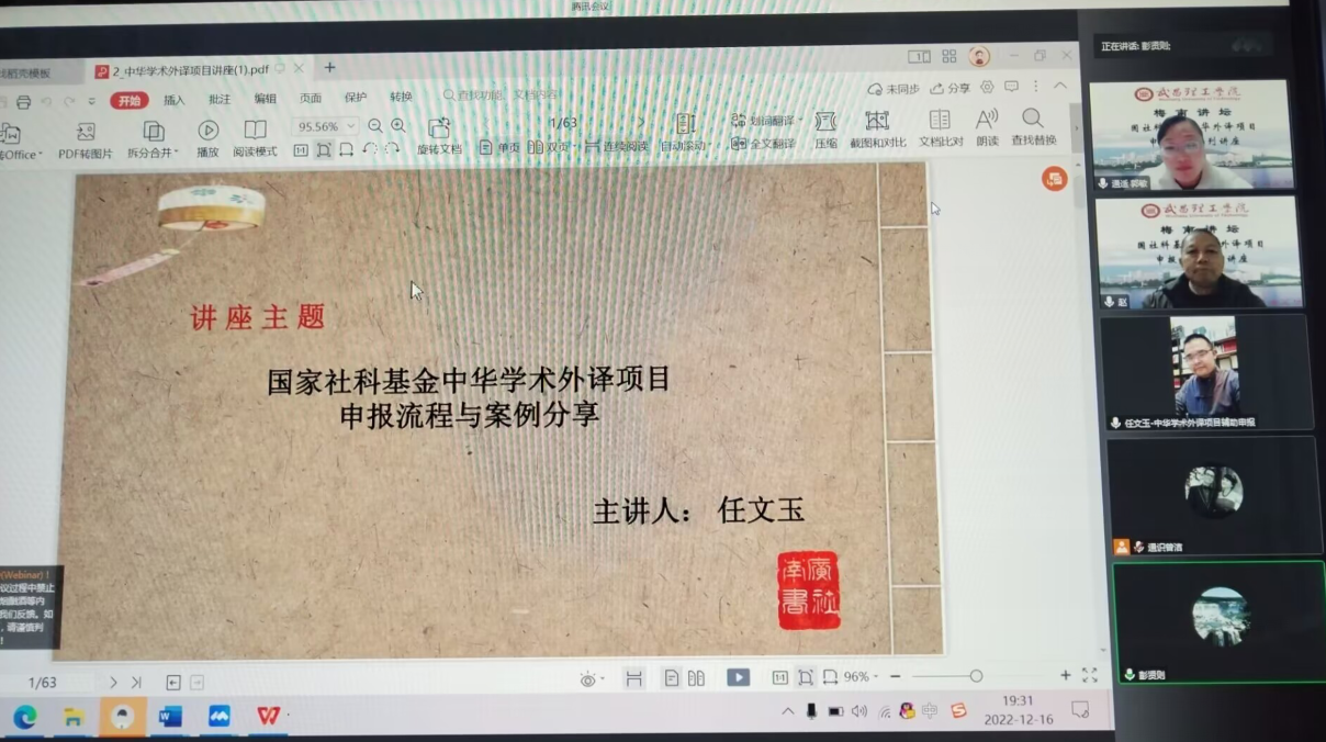中兴学人(北京)国际文化传播有限责任公司总编、泰晤士学术出版社董事长任文玉先生云端相约永利集团304梅南讲坛,为我院教师带来主题为“国社科基金中华外译项目申报流程及案例分享”的科研讲座。全院教师共同聆听学习,讲座由院助郭敏副教授主持。