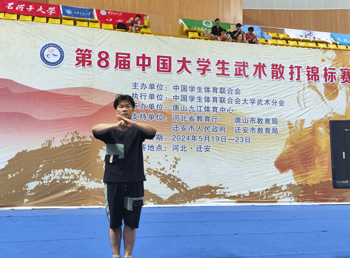 近日,由中国学生体育联合会主办的第八届中国大学生武术散打锦标赛圆满落幕。来自全国165所高校的1300余名武术散打健儿汇聚河北省迁安市唐山九江体育中心体育馆,以武会友、争雄逐鹿,展示传统武术精髓,弘扬中华武术精神。我校武术散打代表队首次参加该级别的赛事,我校健儿参加的甲A组有200多名运动员,经过5天激烈的比赛,永利集团304武术散打代表队喜获佳绩,工美2102班的张俊同学获得男子甲A组74公斤级第5名的优异成绩。