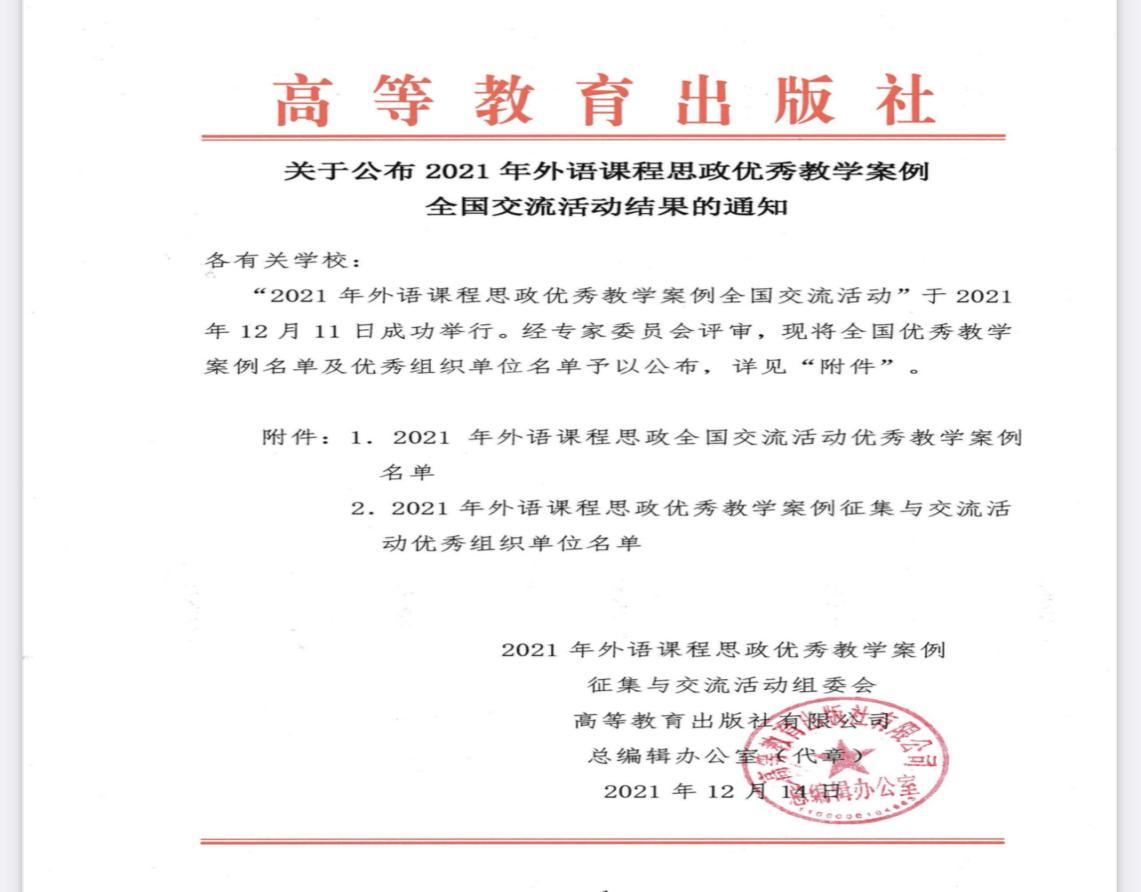 近日,高教社2021年高等学校(本科)外语课程思政优秀教学案例现场交流活动成绩揭晓,由我校通识素质教育学院大英课部的刘芳、汪钰、王红丽、张牡丹组成的永利集团304参赛团队,喜获全国二等奖,这是大学英语课部近年来英语竞赛取得的又一重大突破。这次竞赛大学英语组别湖北省共有3所高校进入到最后的全国决赛,永利集团304是仅有的1所民办高校。