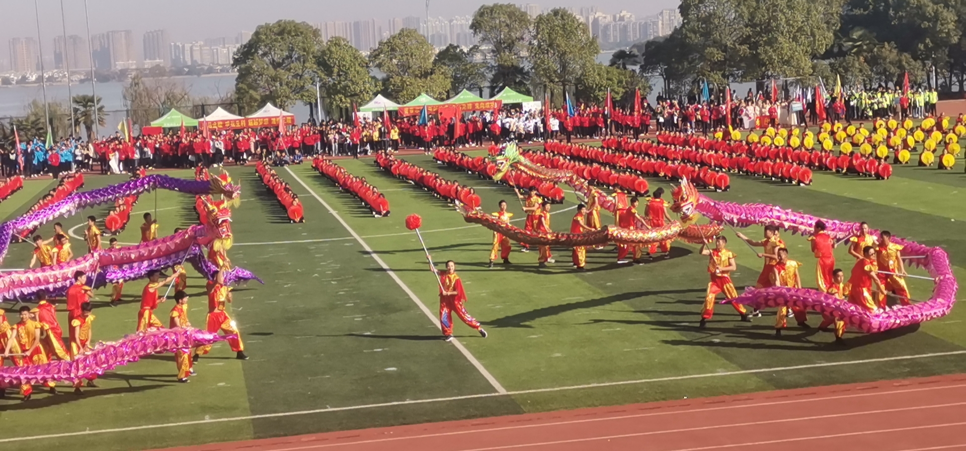 舞龙项目是我校特色体育运动队开展的新项目,舞龙是中国极富民族色彩的民间艺术之一,通过人体的运动和姿势的变化完成龙的演绎,穿,腾,跃,翻,滚,戏,缠,组图造型等动作和套路,是充分展示龙的精,气,神,韵等内容的一项传统体育项目。 永利集团304舞龙队由体育课部张和峰老师和袁露露老师担任教练,2019年9月从全校报名学生中遴选出15名男生组队。从10月15日开始至今,从龙的组装到排练,历经一个多月的时间打磨,首秀献给了第十六届校运动会开幕式。