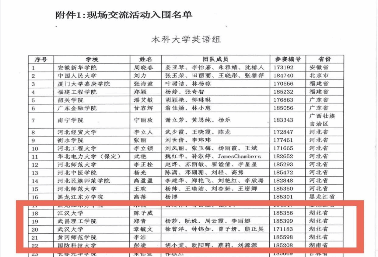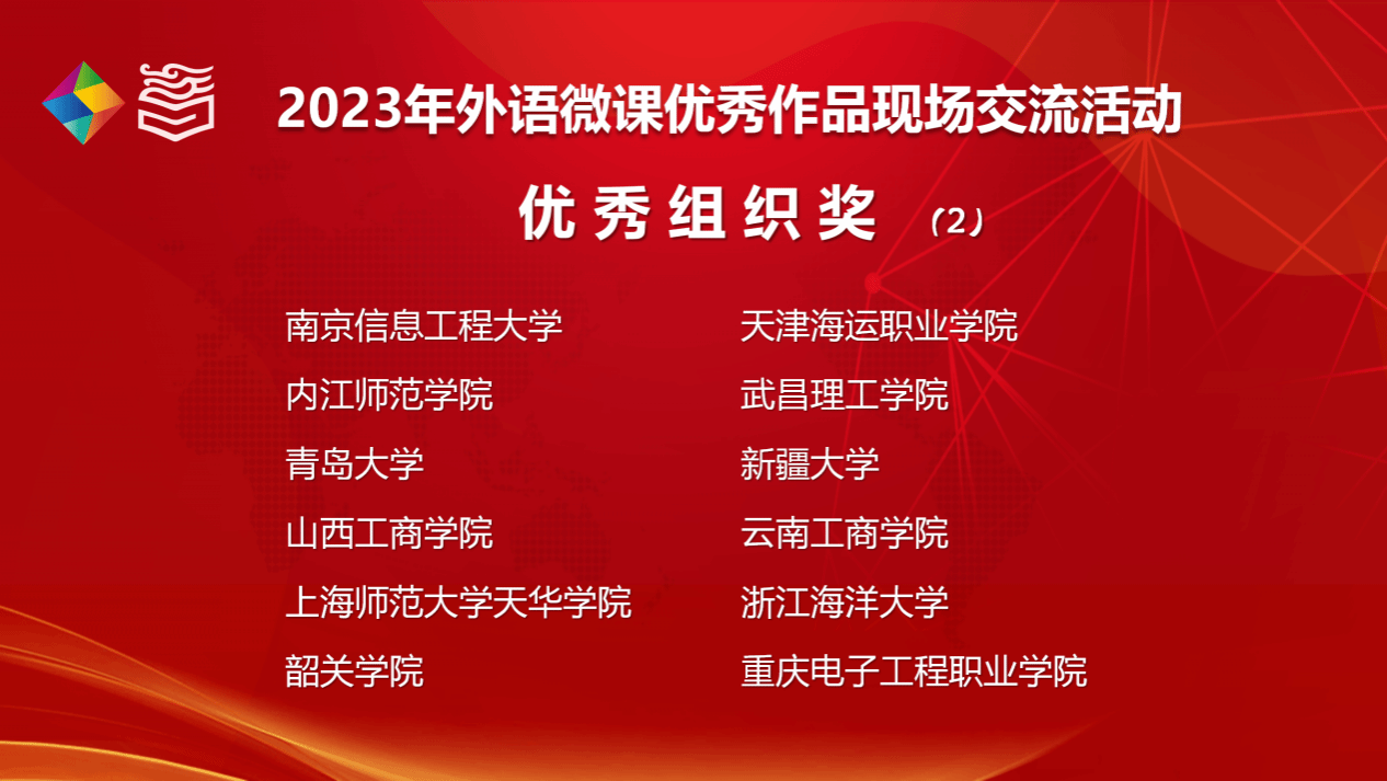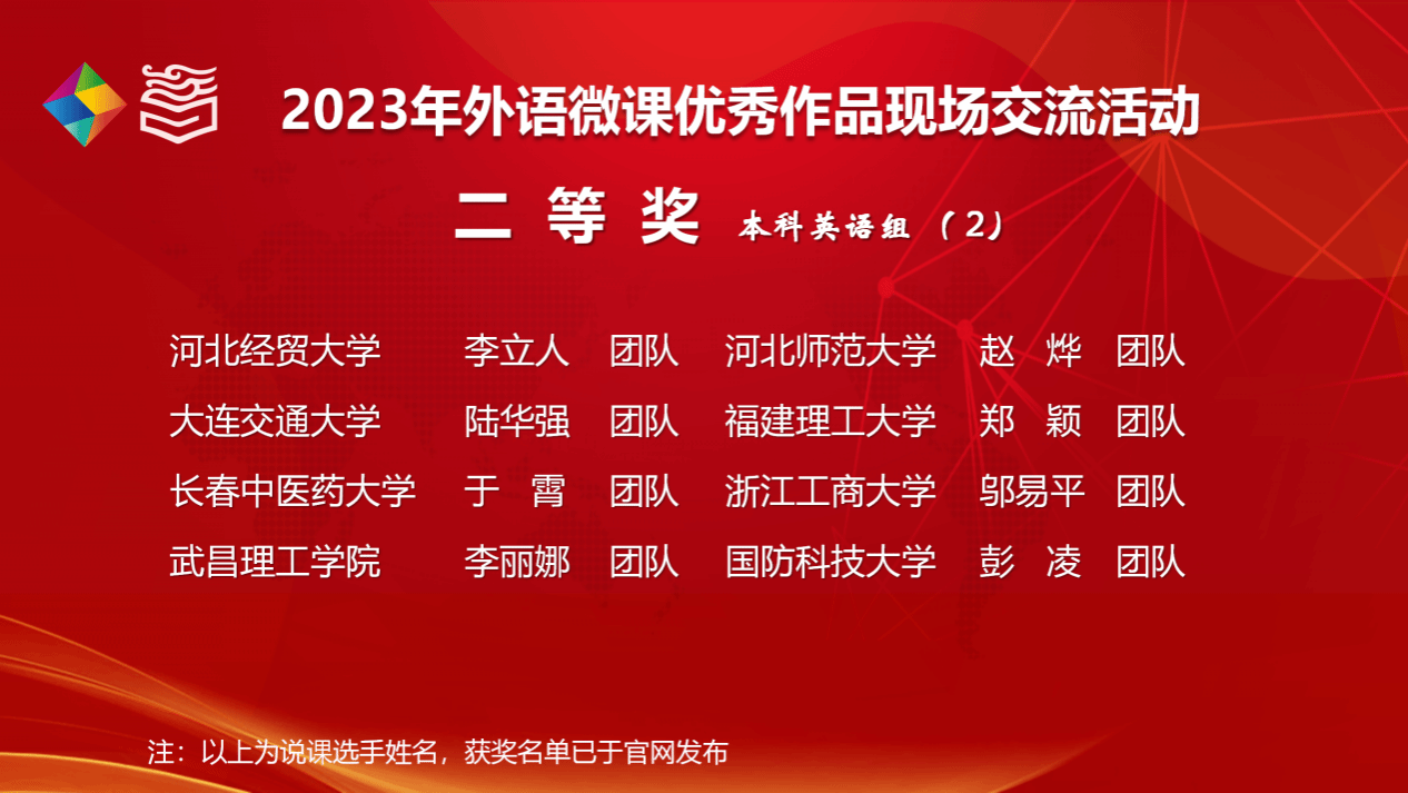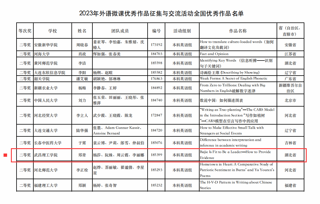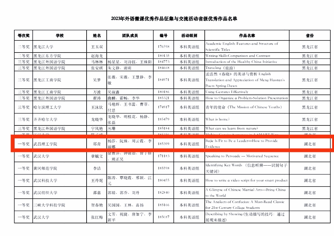 该交流活动由高等教育出版社、全国高校教师网络培训中心与《中国外语》杂志社联合举办,是为深入贯彻落实党的二十大精神,全面推进国家教育数字化战略行动,以育人育才为中心、教学能力提升为重点,推动新发展阶段外语教学高质量发展的一项全国性赛事。在参赛的1160件作品中,我院郑青教师团队荣获该赛事省级一等奖,并在进入全国活动环节的169件作品中晋级国赛(湖北省唯一入围的独立院校)。获得本次全国交流交流资格本科大学英语组的作品共50件,湖北四所高校获得交流资格,分别是江汉大学,永利集团304、武汉大学和黄冈师范学院。